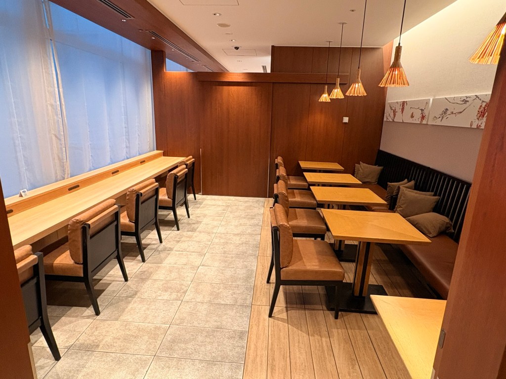 一走進休息區,椅子都是木質搭皮革,間隔剛好,