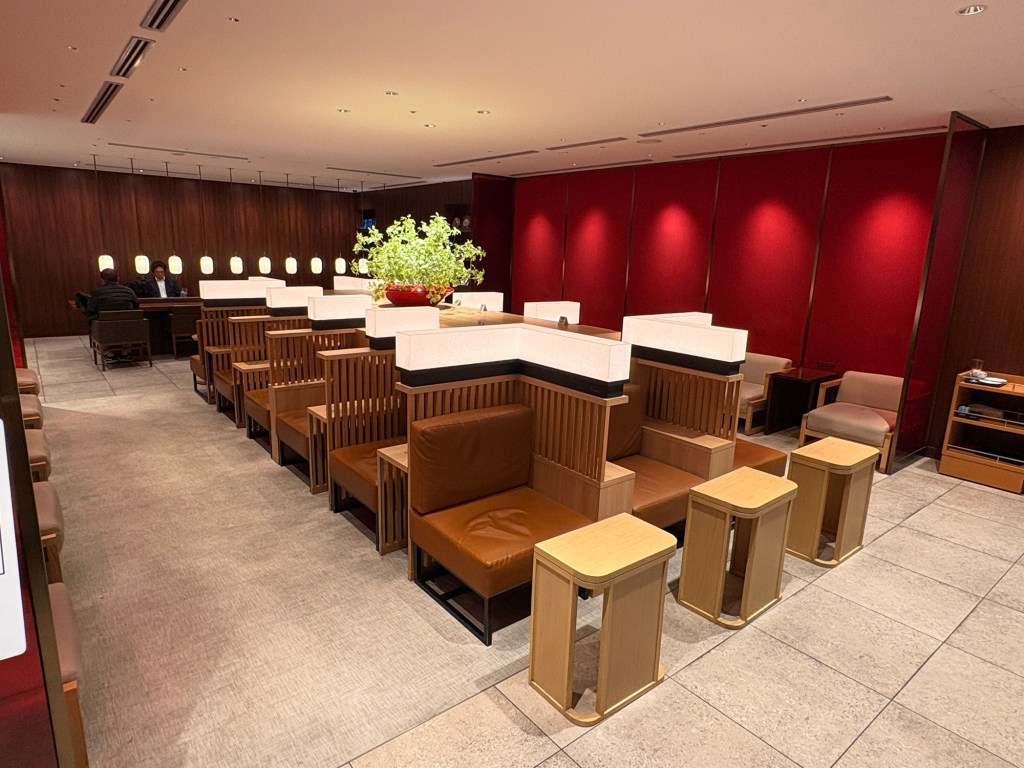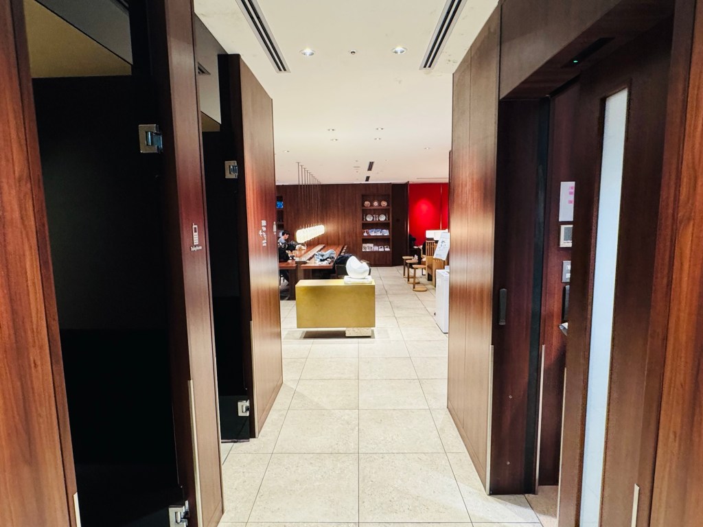 但如果你是 JAL 頭等艙的鑽石會員、JGC Premier,往左邊轉進去,你會看到一扇低調到不行的「紅色窗簾門」。