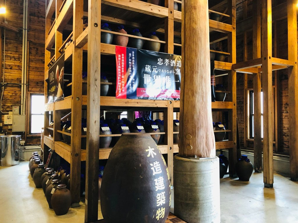 走進忠孝酒造,映入眼簾的是一整排壯觀的 大型陶甕與木造熟成庫。不同於許多酒造使用不鏽鋼桶,忠孝酒造也堅持使用沖繩傳統技術製作的陶甕進行熟成。