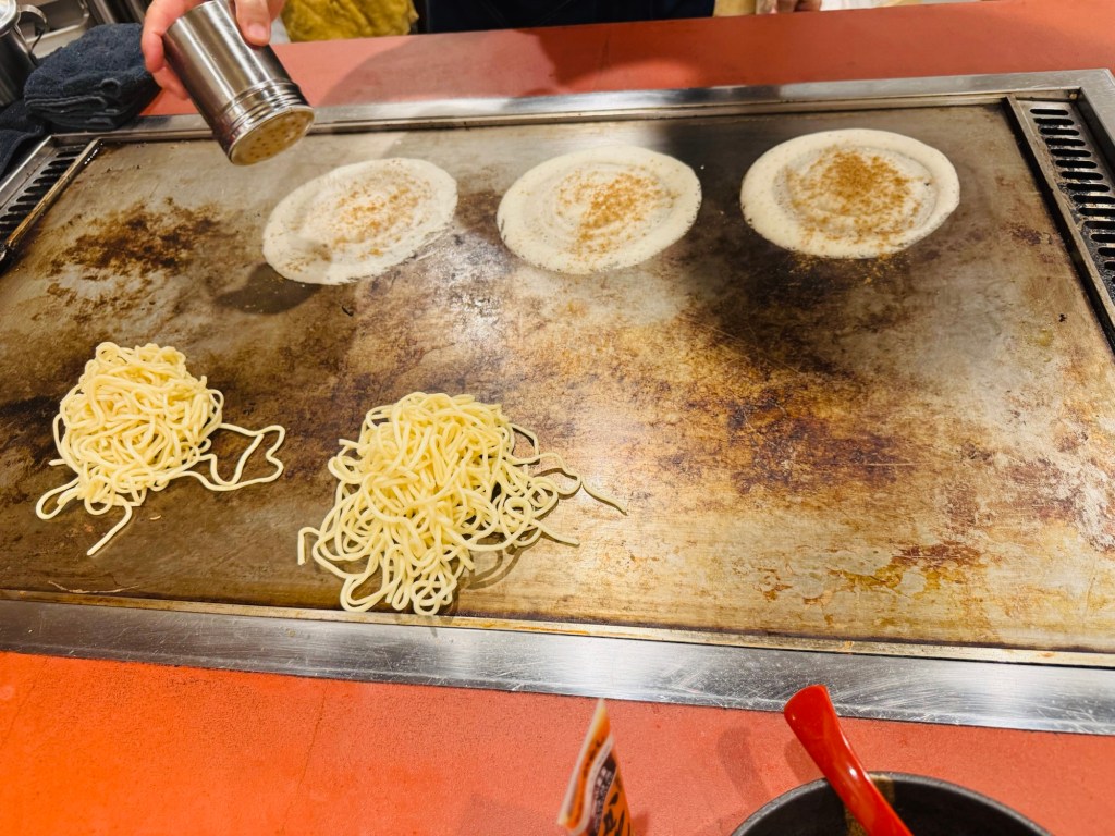 鐵板上堆得蓬鬆的炒麵、配上大份量蔬菜,再蓋上一層金黃蛋皮,最後刷上特製醬汁,香氣濃郁到完全無法抗拒。