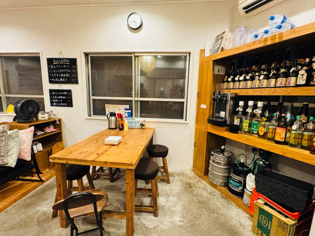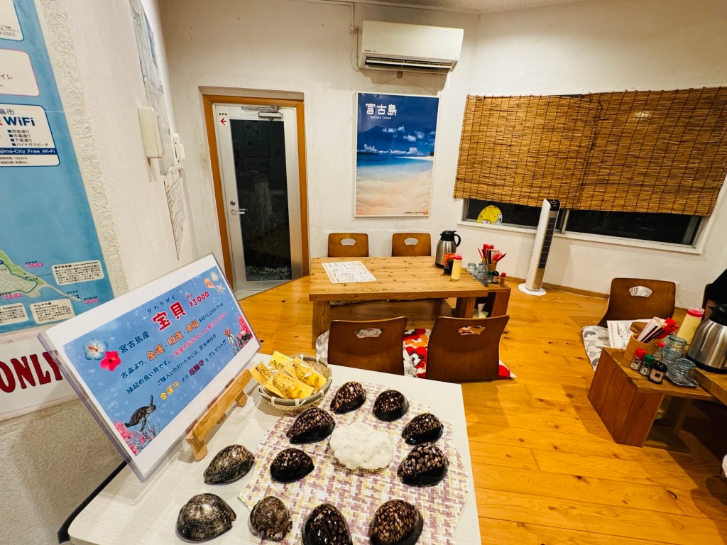 架上滿滿的泡盛酒瓶、宮古島地圖、在地小物,讓人更覺得「這就是宮古島的日常」。