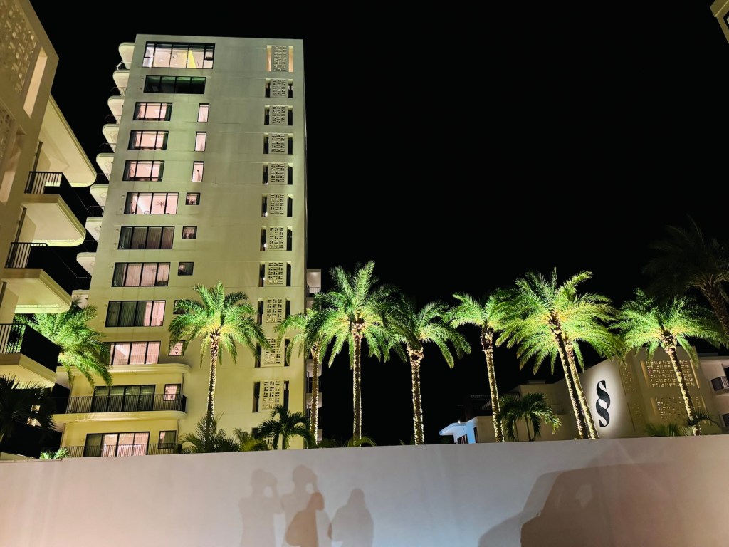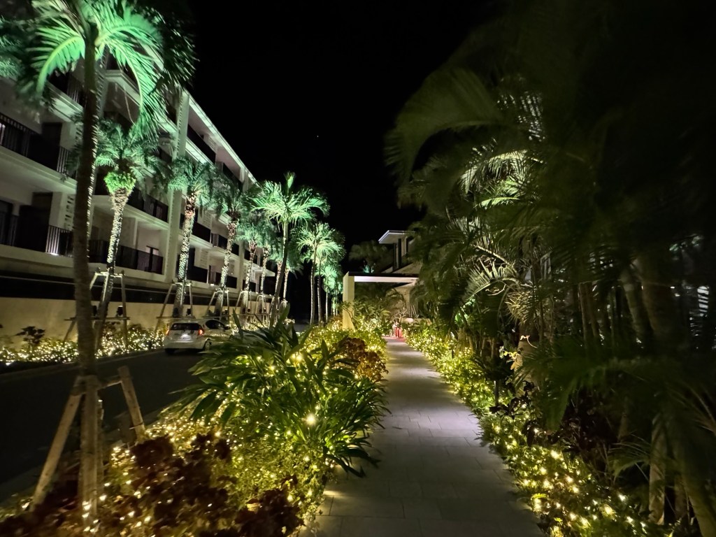 夜晚的飯店外觀被燈光勾勒出輪廓,高聳椰子樹與低彩度建築讓人瞬間有置身國外渡假村的錯覺。