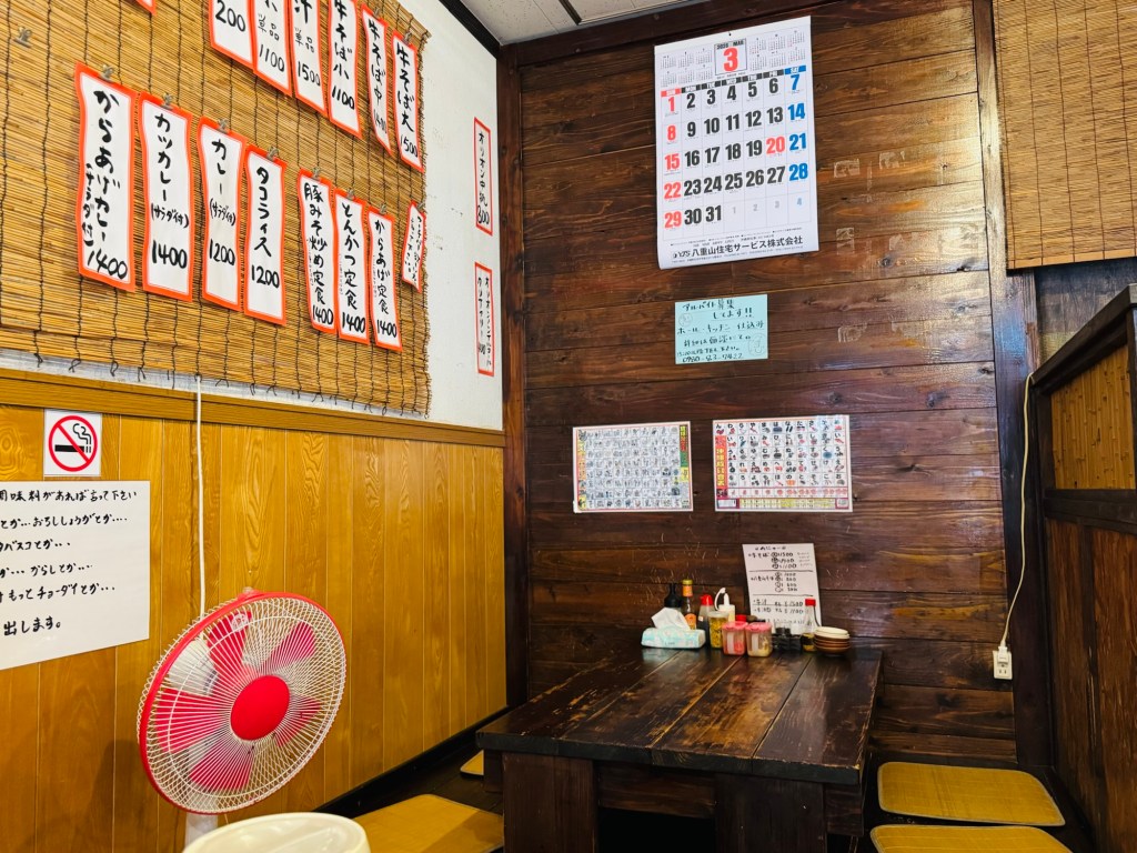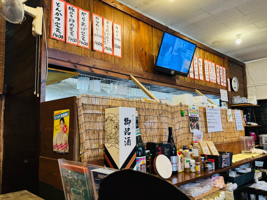內部裝潢非常樸實,木桌、竹簾菜單、手寫價格牌,充滿地方食堂的生活感。